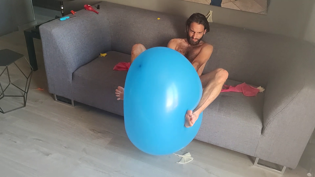 During 5 minutes Julien fight with giant balloons to burst them.